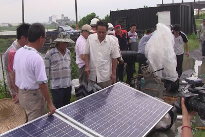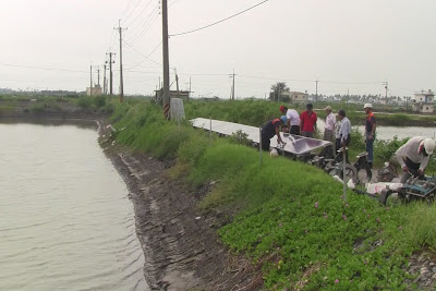 這天,劉天福的漁塭旁,聚集了許多人,廠商忙著組裝的工程,趕著等一下的「下水典禮」,屏東縣長曹啟鴻也感到現場關心進度,還有兩組紀錄片工作者全程紀錄,大家都期待著,這歷史性的一刻。