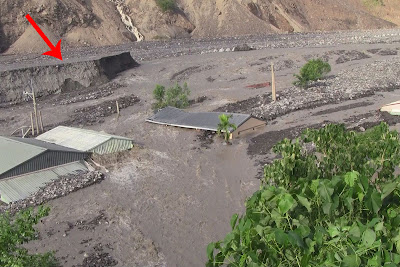 箭頭所指處,為凡那比之後,遭沖毀的堤防殘跡 |