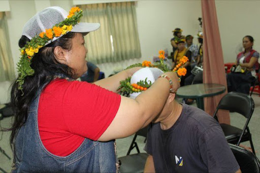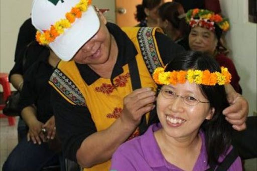 為了讓成果展更豐富,伊那們編織了花環給予會的來賓戴上,位現場的氣氛增色不少。(三地門家扶彩虹工作站 提供) |