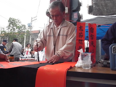 現場揮毫的志工中,有位鄉公所的員工,凡是鄉公所的喜帳輓聯及考取大學的紅榜,皆出自他的手。(攝影/李孟霖) |